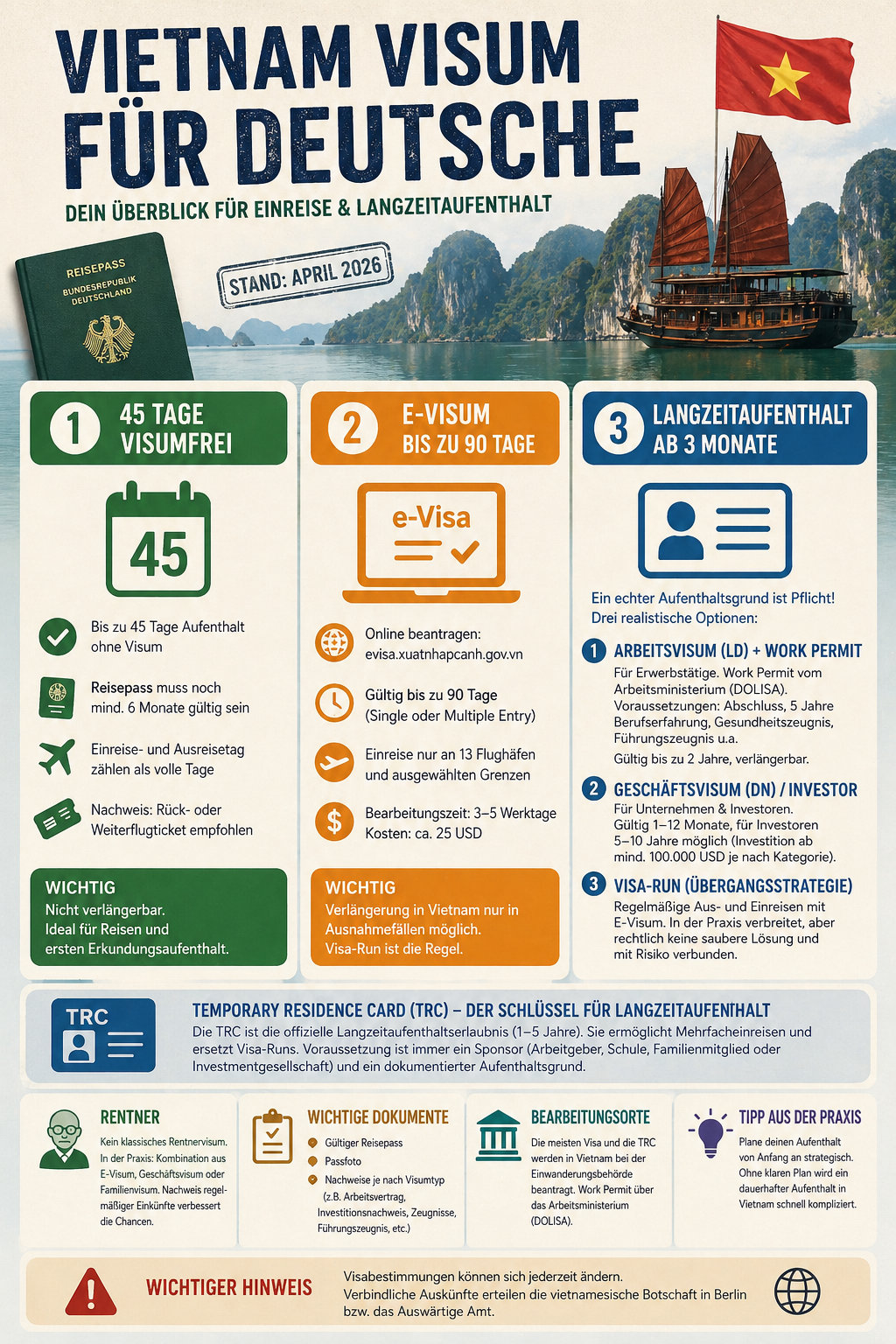 Wichtiger Hinweis: Visabestimmungen ändern sich regelmäßig. Alle Angaben entsprechen dem Stand April 2026. Verbindliche Auskünfte erteilt die vietnamesische Botschaft in Berlin bzw. das Auswärtige Amt.